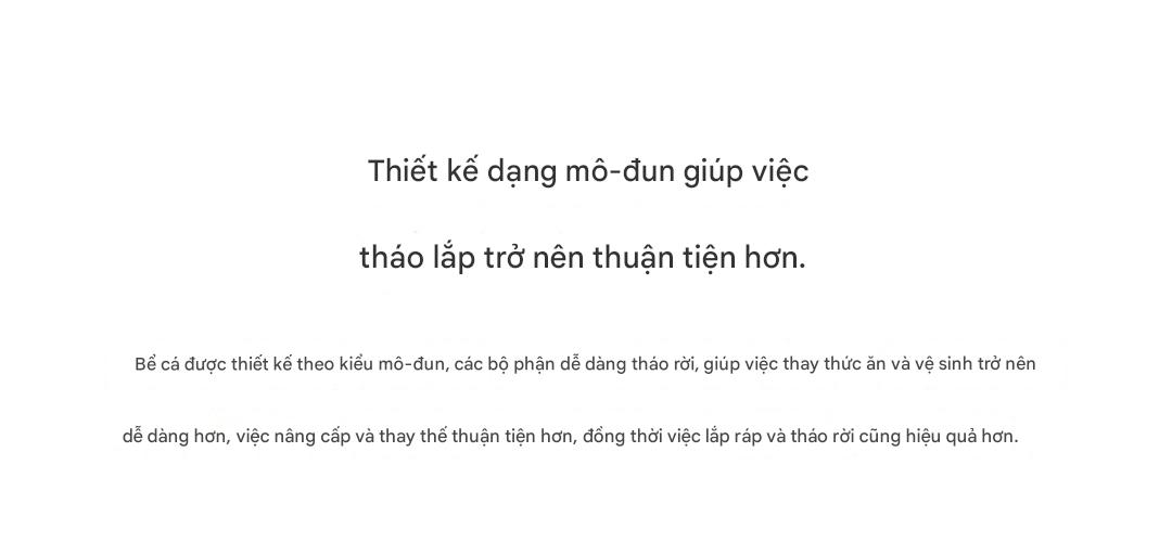 Dành riêng cho người bận rộn: Thiết kế mô-đun thông minh, dễ lắp đặt và vận hành, giải phóng thời gian, giúp việc nuôi cá trở nên nhẹ nhàng, thú vị.