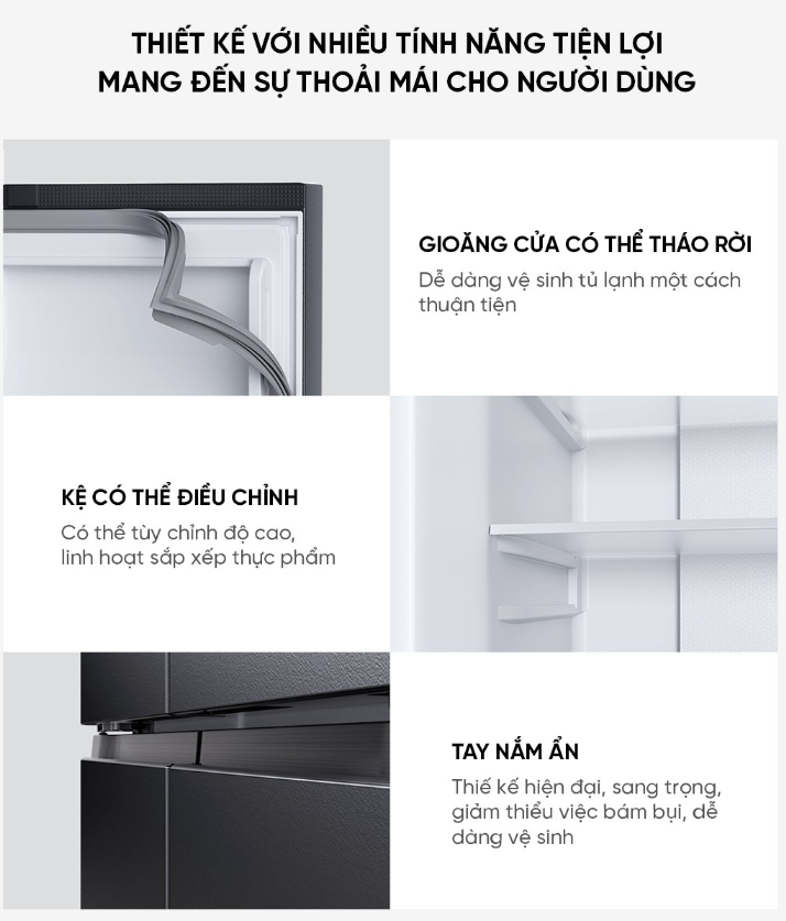 Một trong những ưu điểm nổi trội nhất chính là gioăng cửa có thể tháo rời dễ dàng. Chi tiết này giúp việc vệ sinh tủ lạnh trở nên thuận tiện hơn bao giờ hết. Loại bỏ hoàn toàn nơi trú ngụ của vi khuẩn và nấm mốc ở những khe hở khó chạm tới. Đảm bảo môi trường lưu trữ thực phẩm luôn sạch sẽ.
