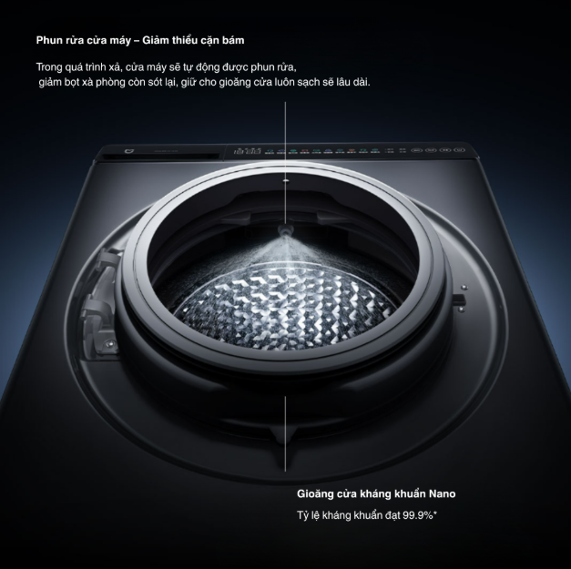 - Phun rửa cửa máy tự động: Trong quá trình xả, một vòi phun riêng biệt sẽ rửa sạch phần kính và gioăng cửa. Giảm thiểu cặn xà phòng và bọt sót lại.